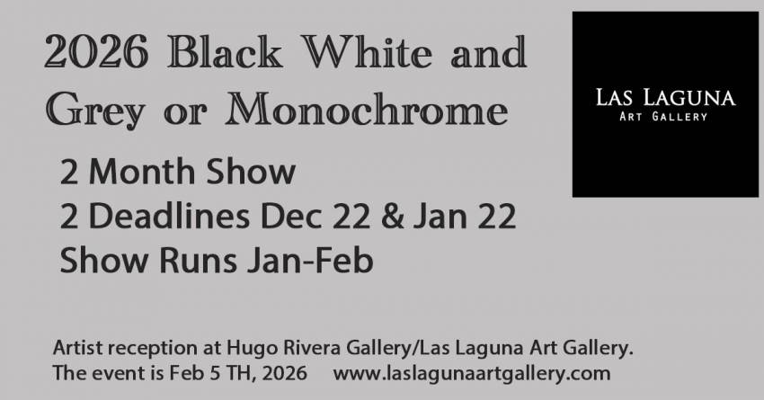 For this exhibition Las Laguna Art Gallery challenges artists to use Black, White or Grey or a combination thereof. All local, national and international artists, professional and amateur are encouraged to apply.