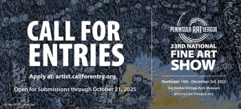 The Peninsula Art League seeks entries for the 23rd National Fine Art Show, at the Vintage Aero Museum in Gig Harbor, WA. 11/14 - 12/3/25. $6,500 in prizes and gift certificates and more. Juror: Cable Griffith.